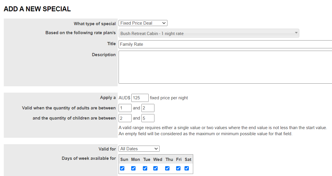 New functionality has been introduced for accommodation providers, allowing them to set up specials which are based on parameters around the number of adults and/or children. This is particularly appropriate to campground clients.