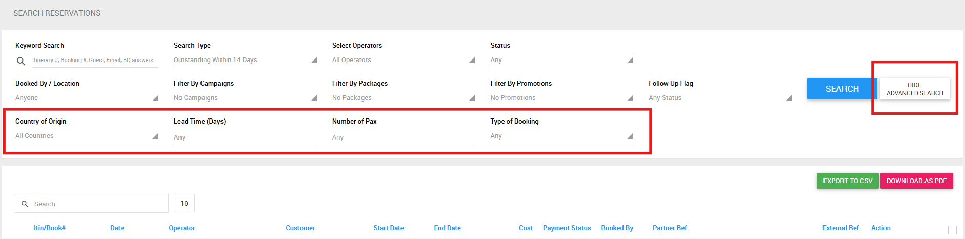 Bookeasy Staff and Room and Tour Manager Console's Reservations Search now includes advanced filters such as Country of Origin, Lead Time, Number of Pax & Booking Type (e.g. Accommodation, Tour, Event).
